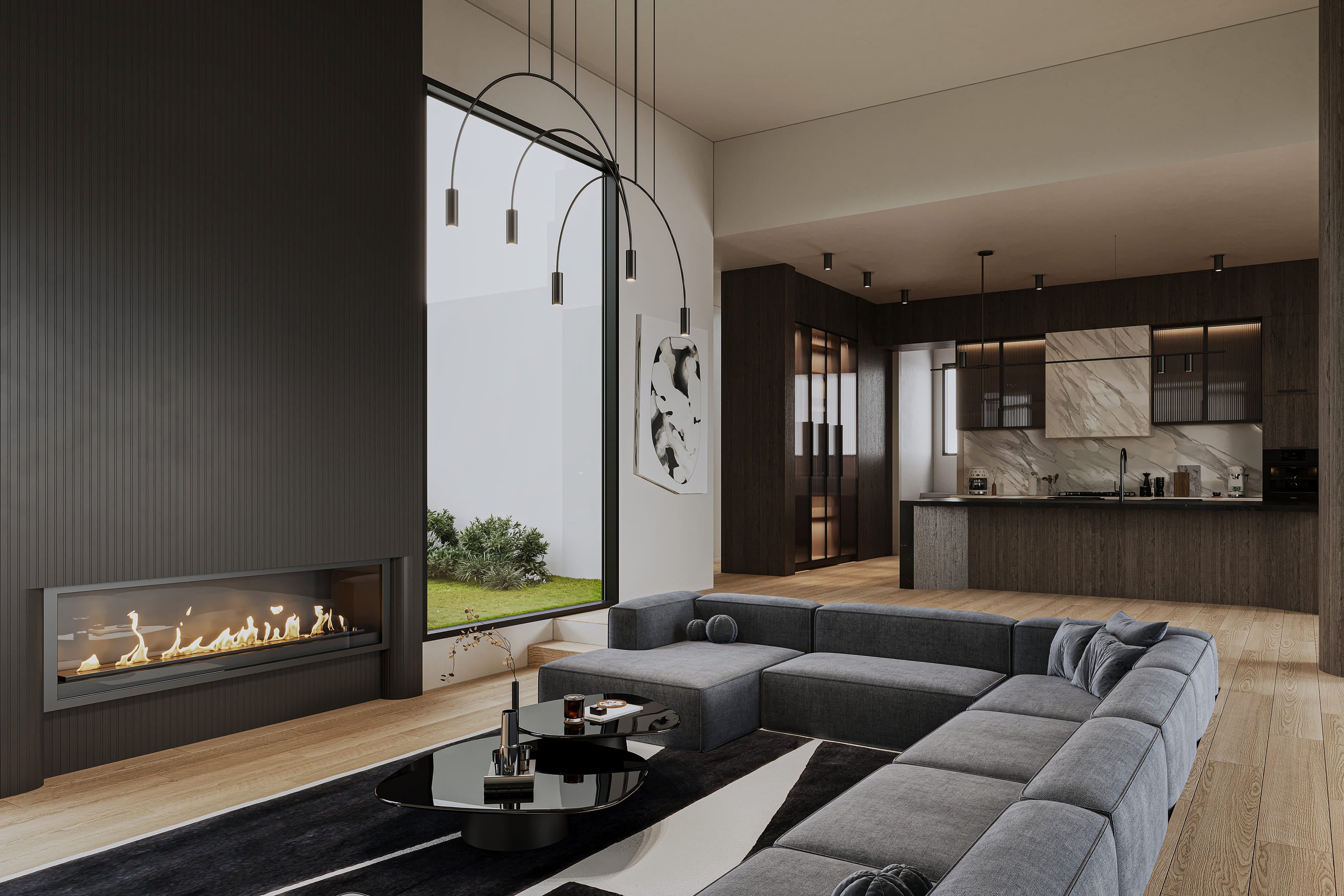 A double-height living space sets the tone for this contemporary home. Sculptural lighting, a sunken lounge, and floor-to-ceiling views come together in a refined palette of marble, timber, and glass. Designed for both presence and comfort, the residence blends bold architecture with warm, livable elegance.